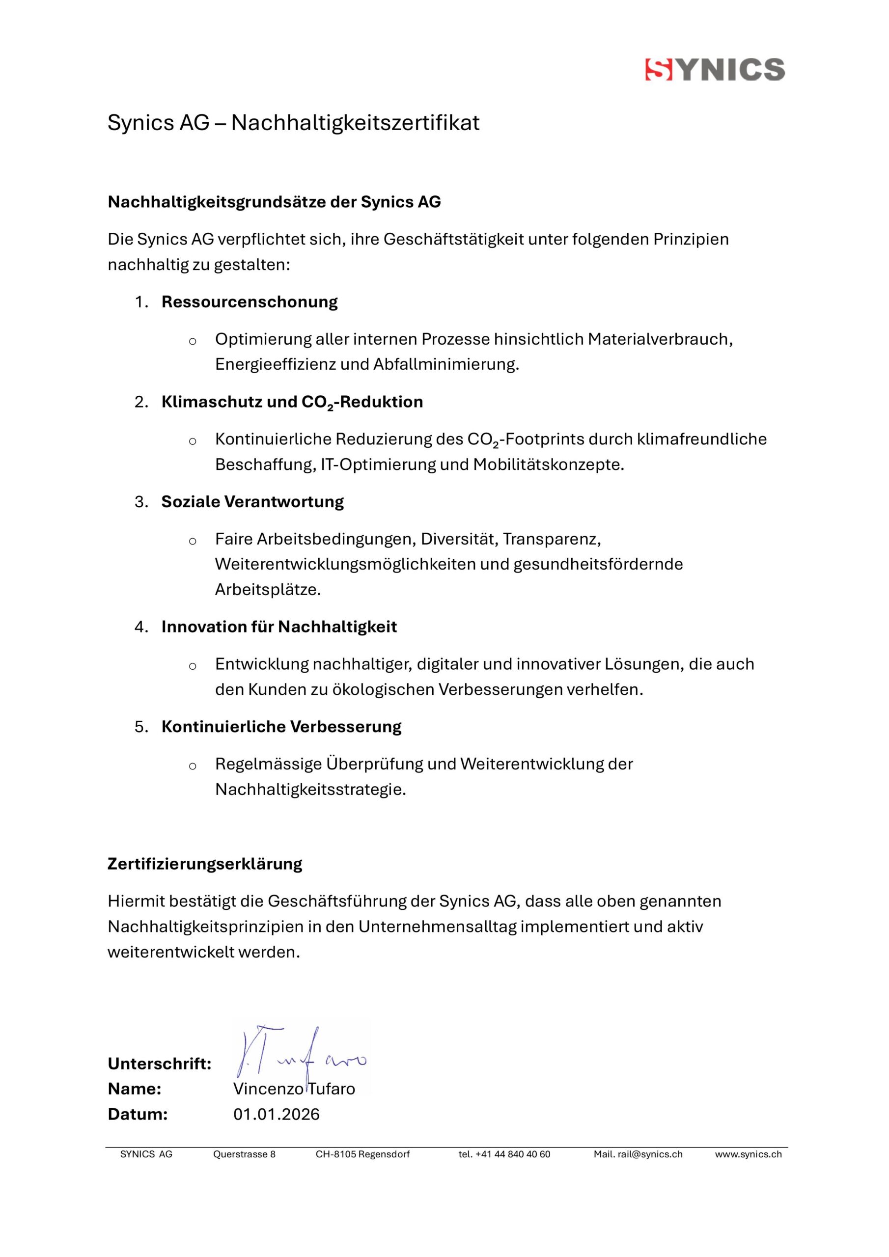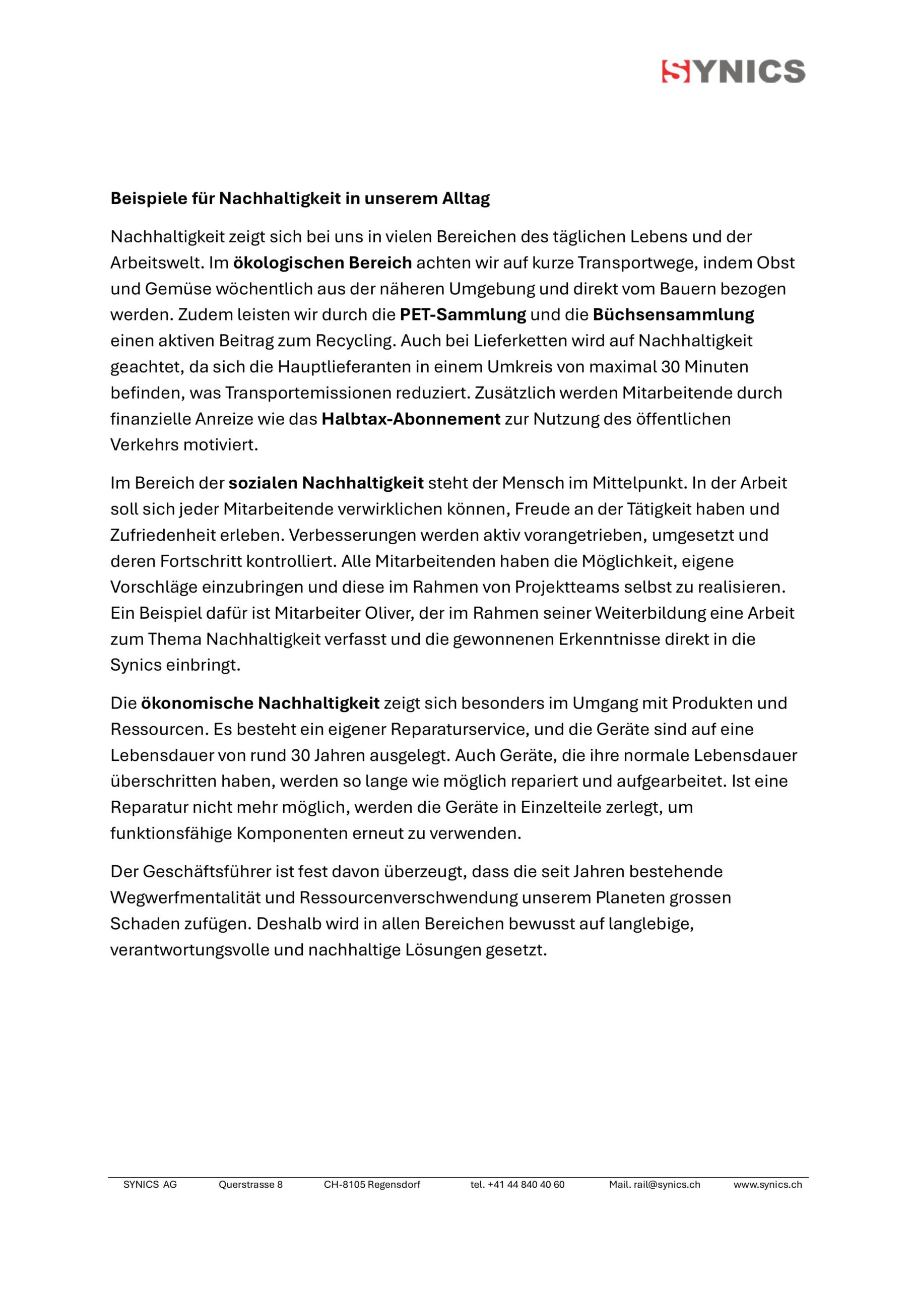 Die Synics AG setzt auf nachhaltiges Handeln als festen Bestandteil ihrer Unternehmensphilosophie. Durch verantwortungsbewusste Prozesse, ressourcenschonende Lösungen und langfristiges Denken verbindet das Unternehmen wirtschaftlichen Erfolg mit ökologischer und sozialer Verantwortung. Nachhaltigkeit wird dabei als kontinuierlicher Prozess verstanden, der Innovation und Qualität gleichermassen fördert.